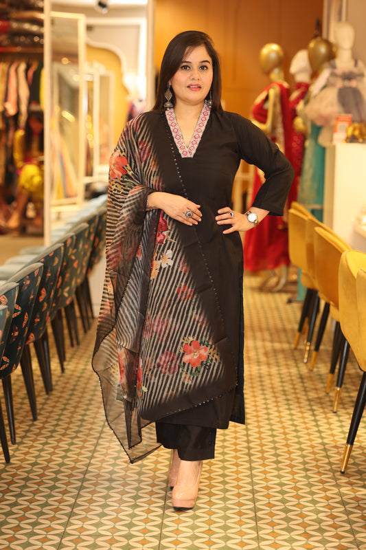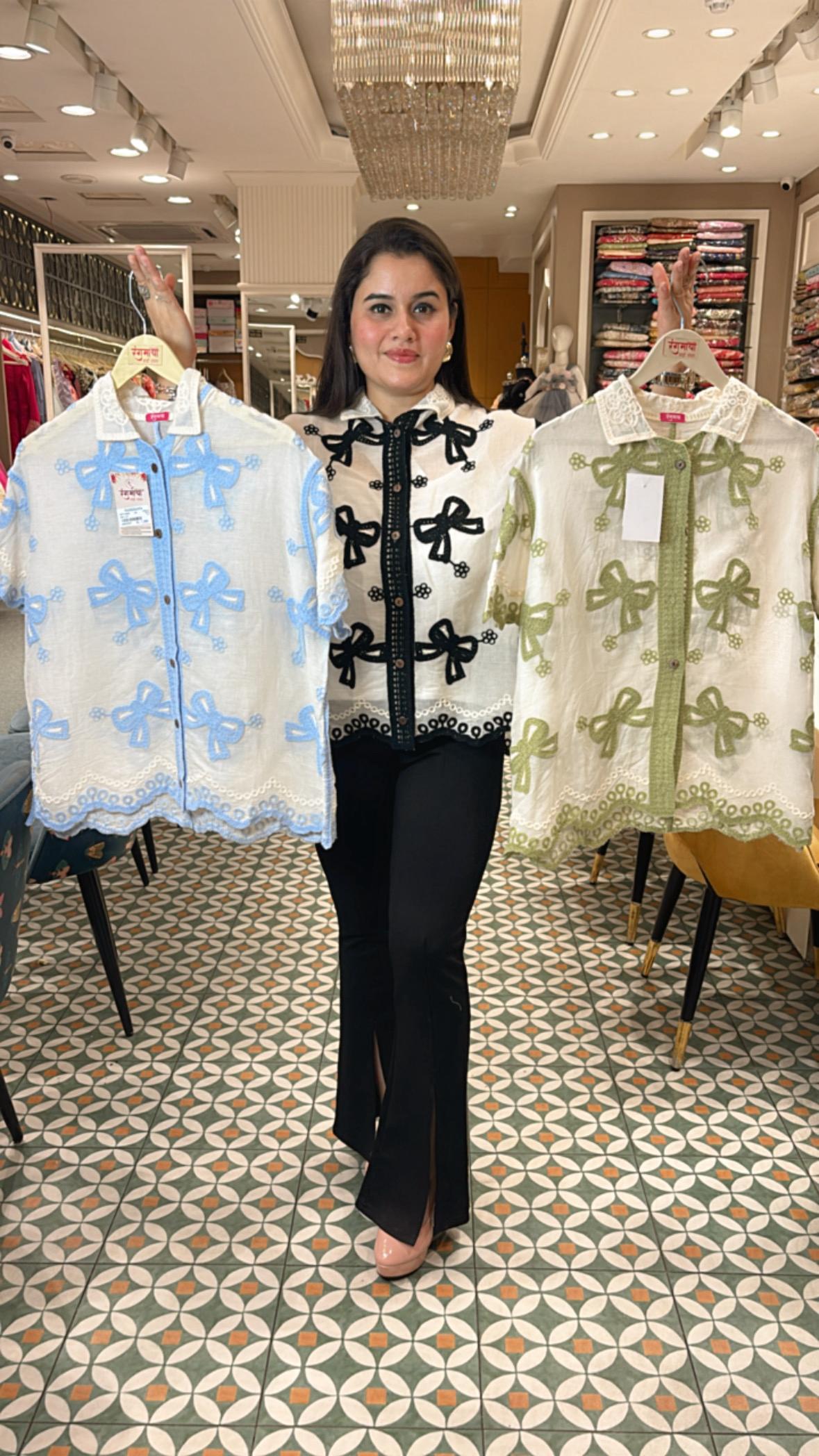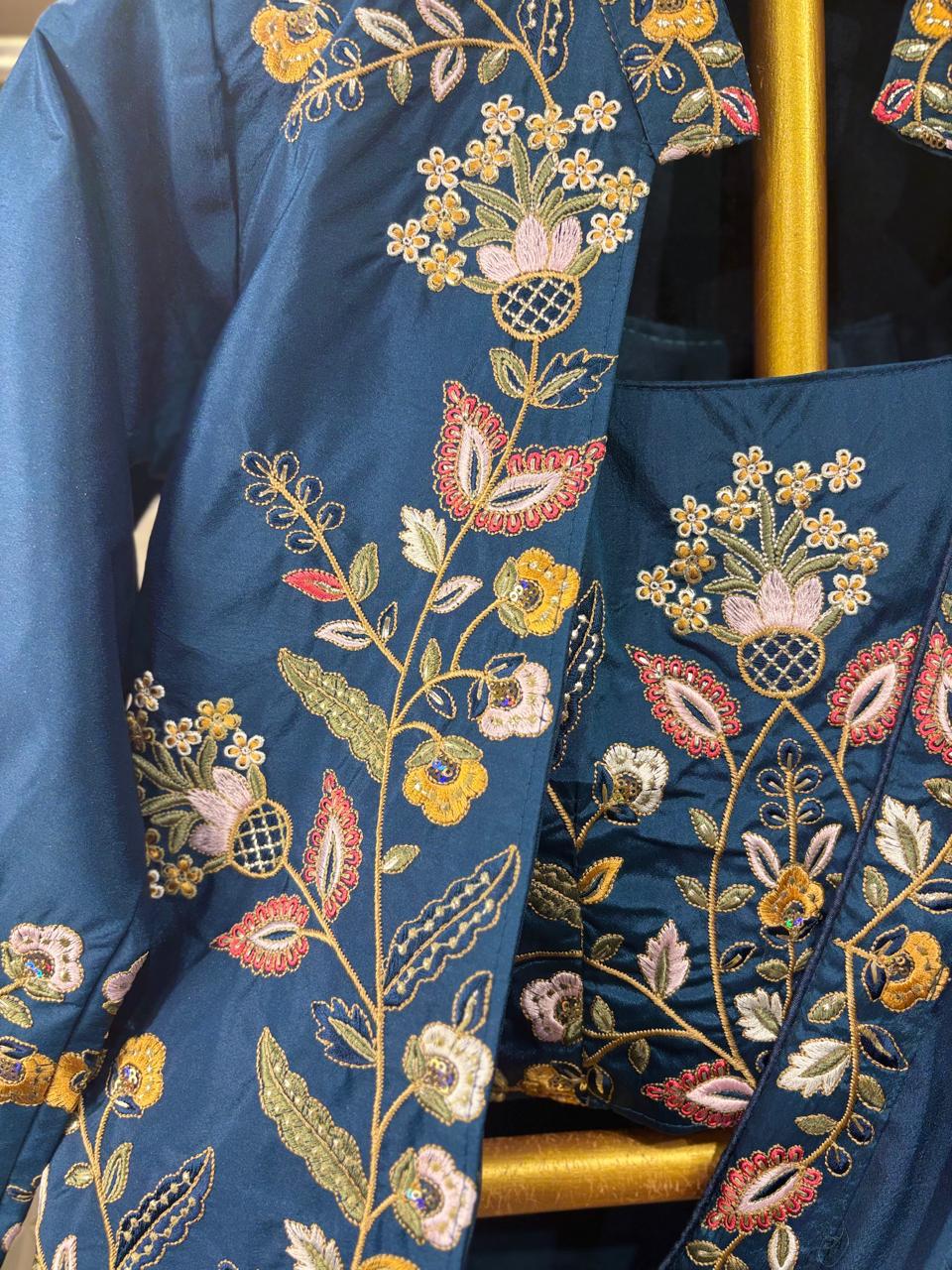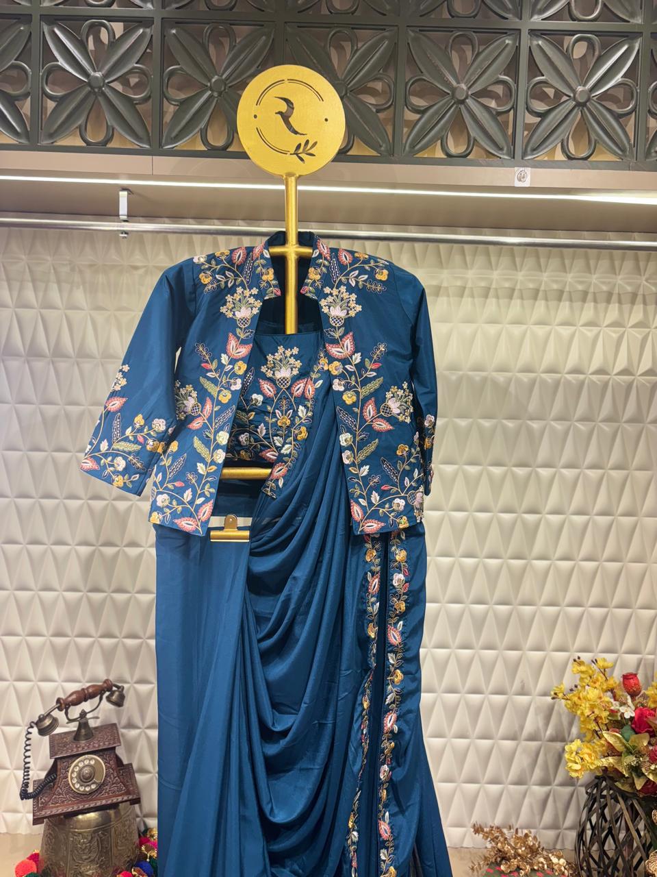 Elegant Blue Embroidered Russian Crepe Stitched Blouse with Inner & Shrug/Jacket