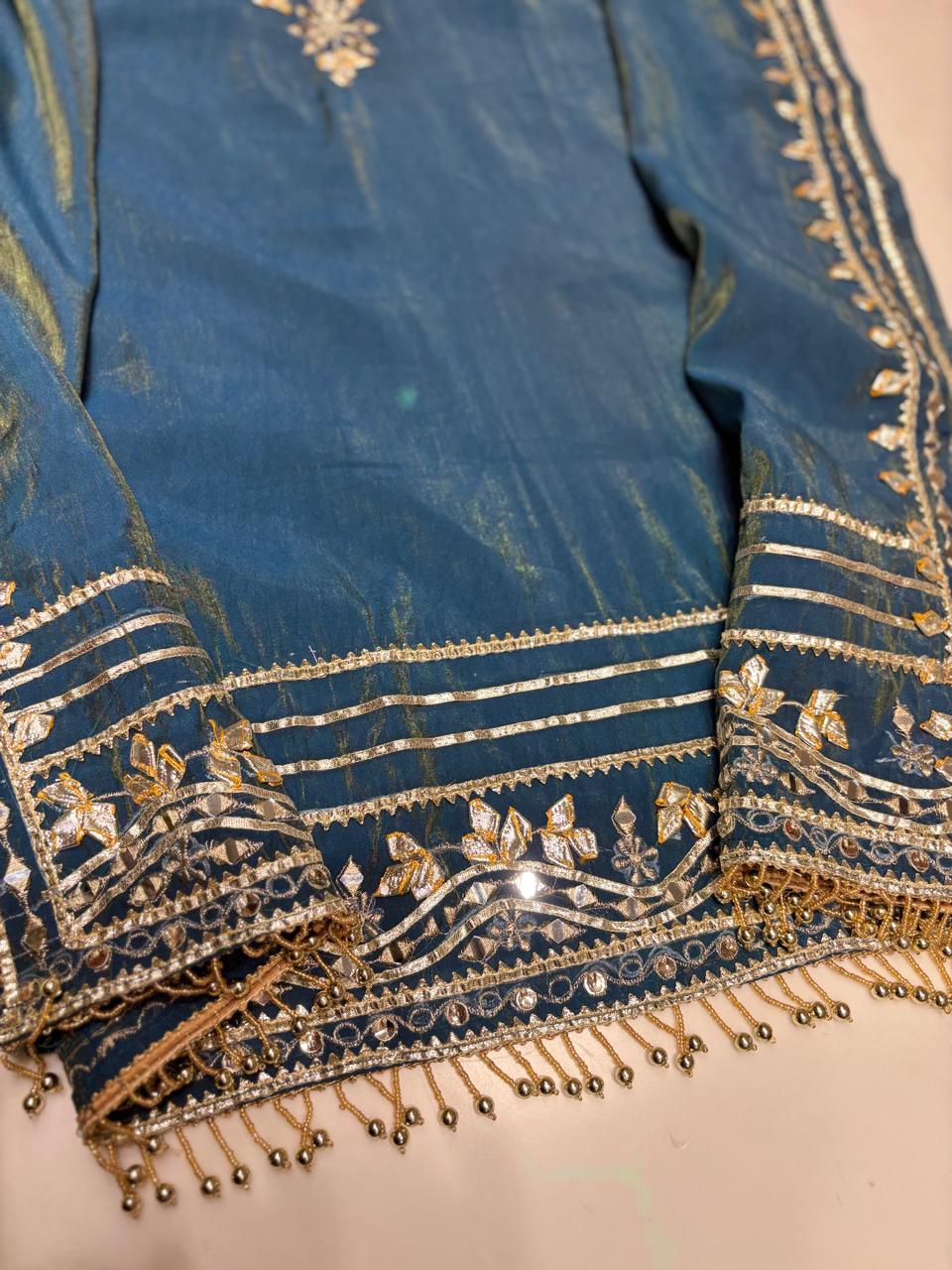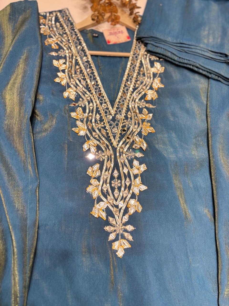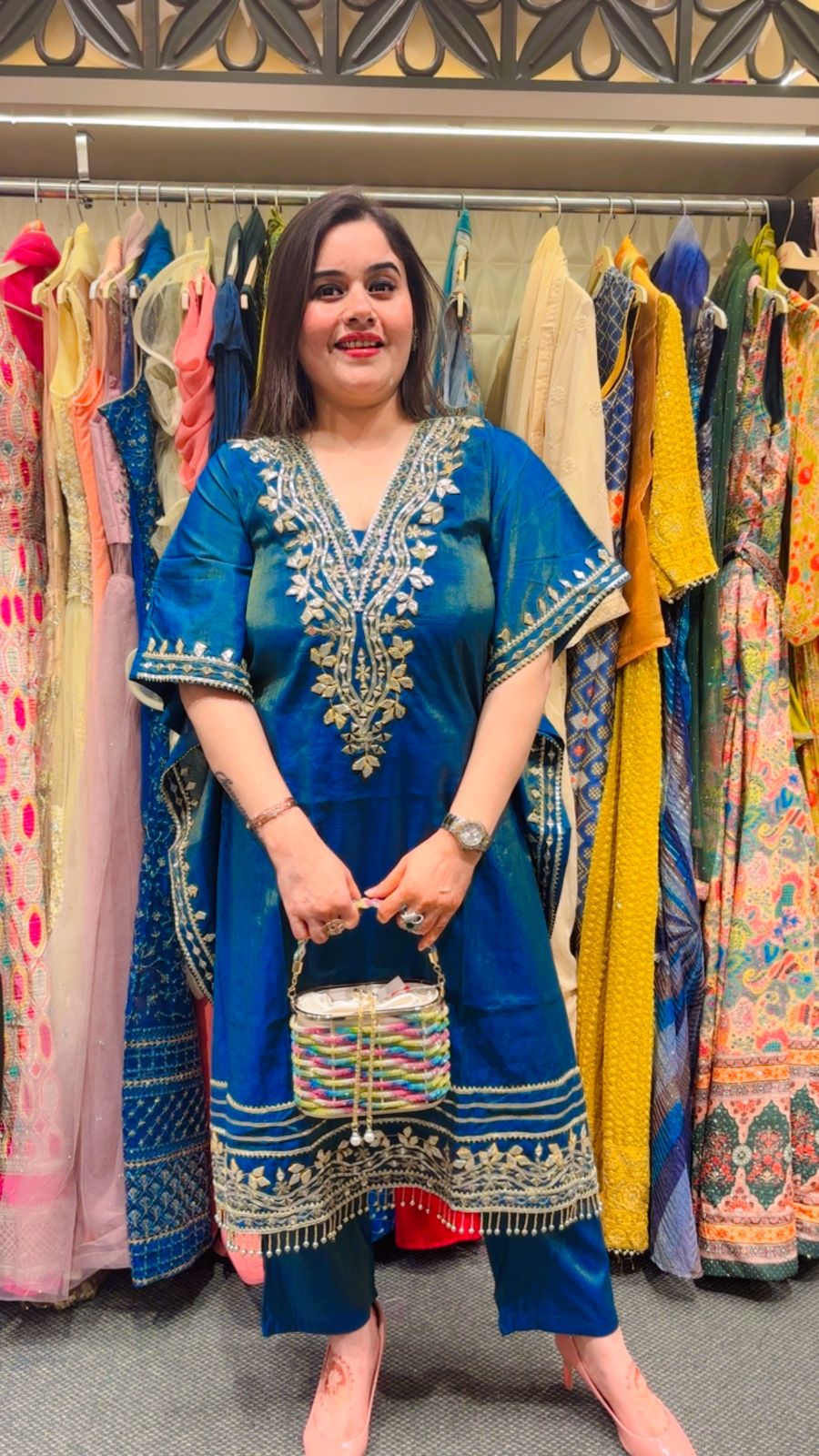 Teal Blue Hand-Embroidered Shimmer Tissue Silk Stitched Kaftan Set – Traditional Elegance