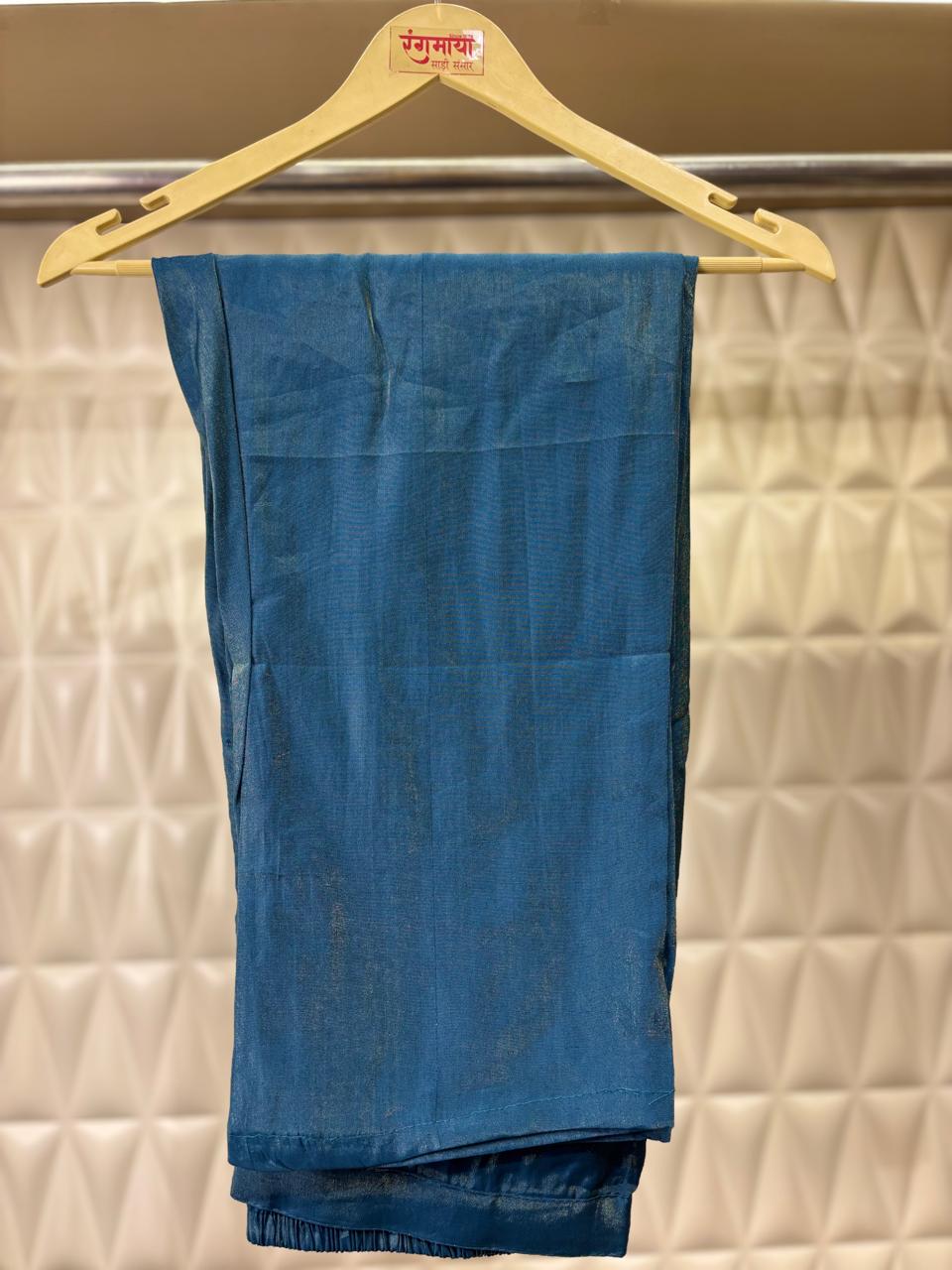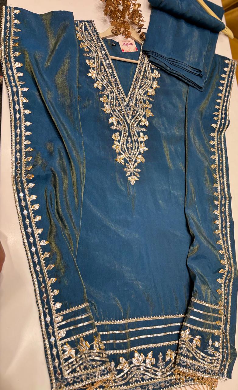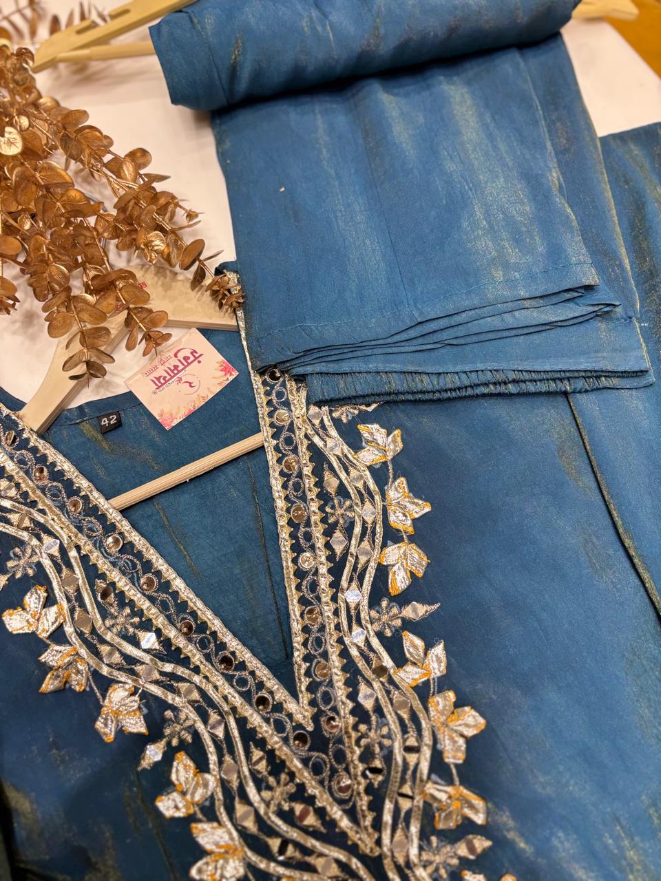 Teal Blue Hand-Embroidered Shimmer Tissue Silk Stitched Kaftan Set – Traditional Elegance