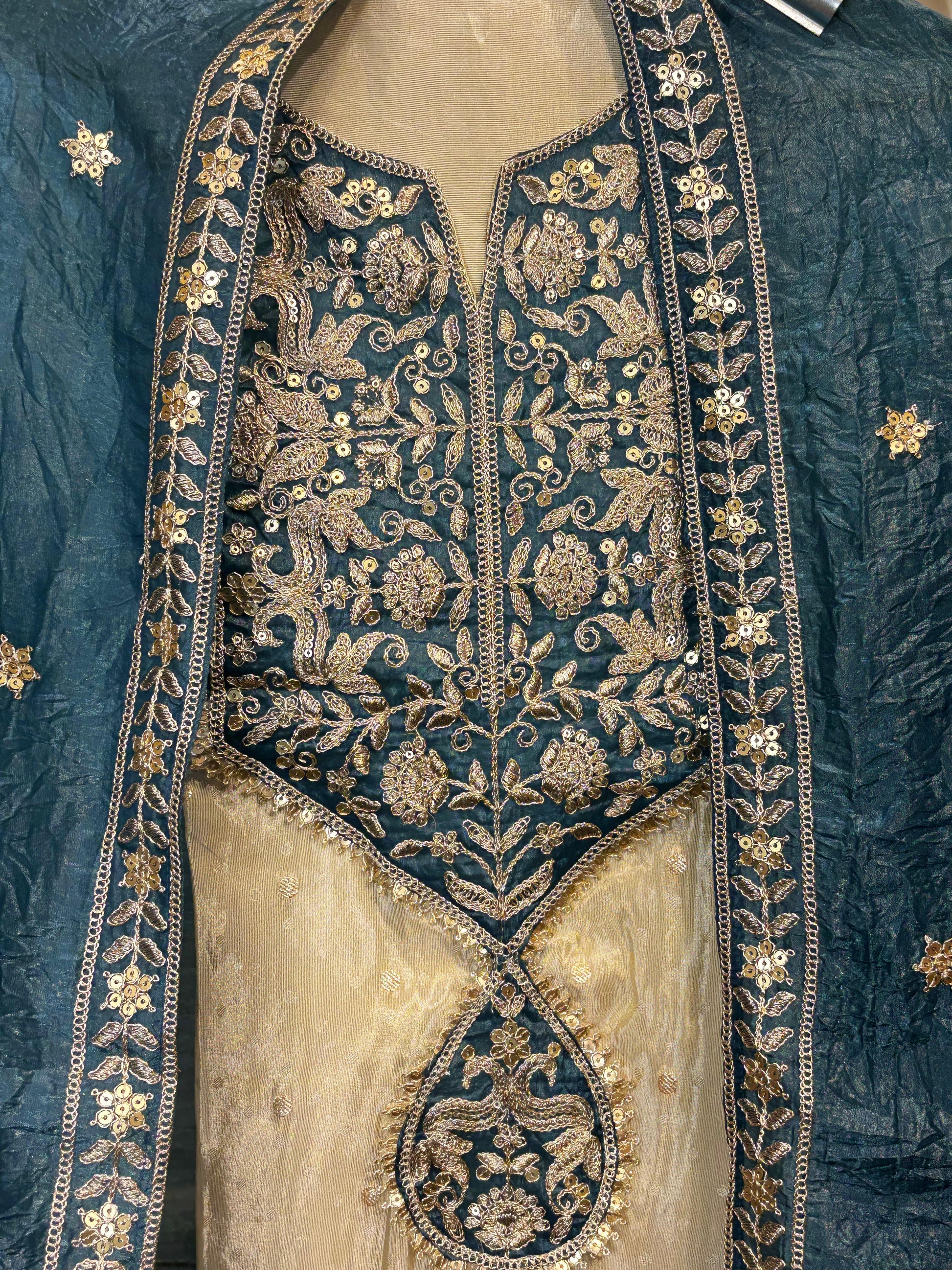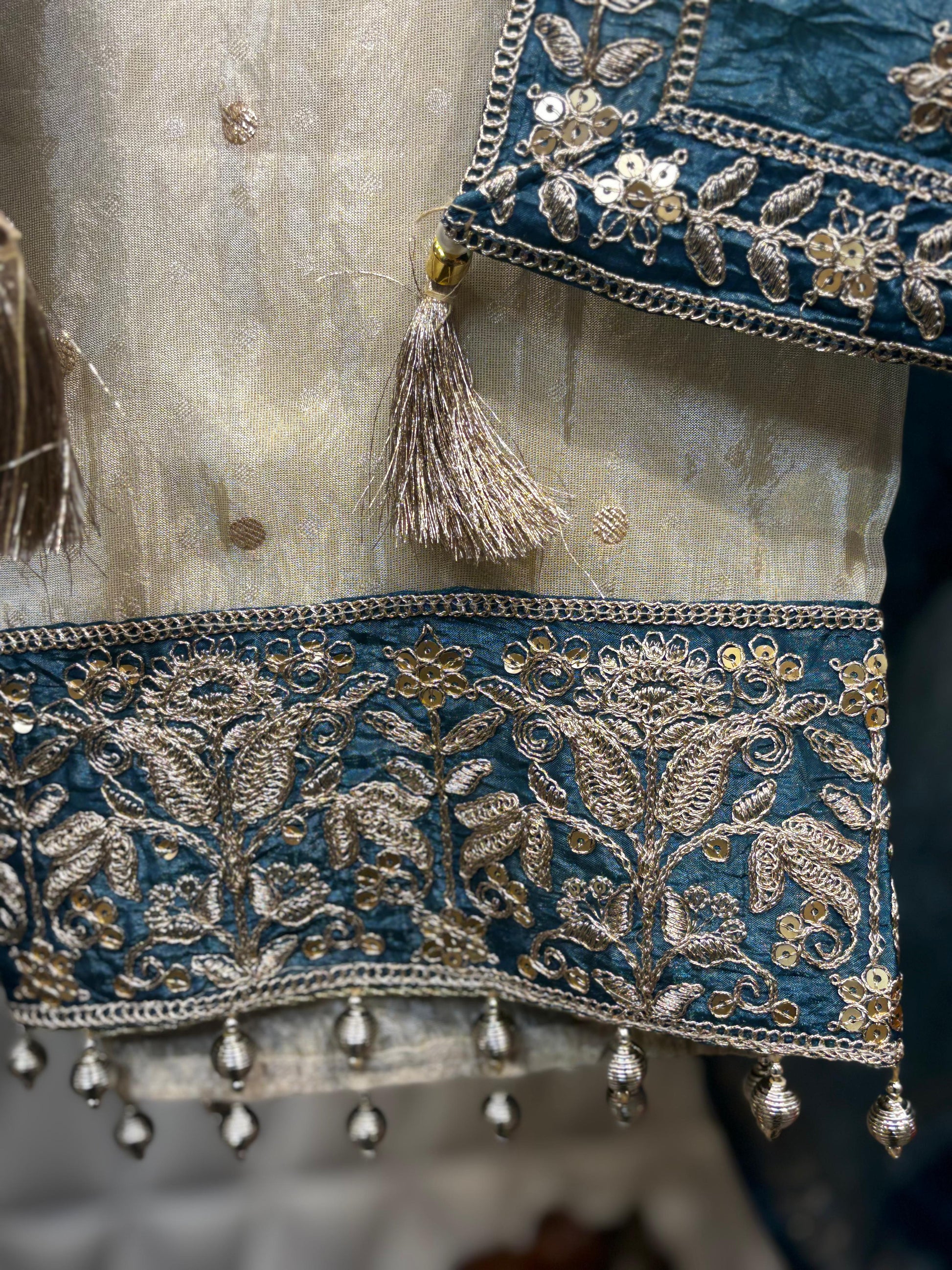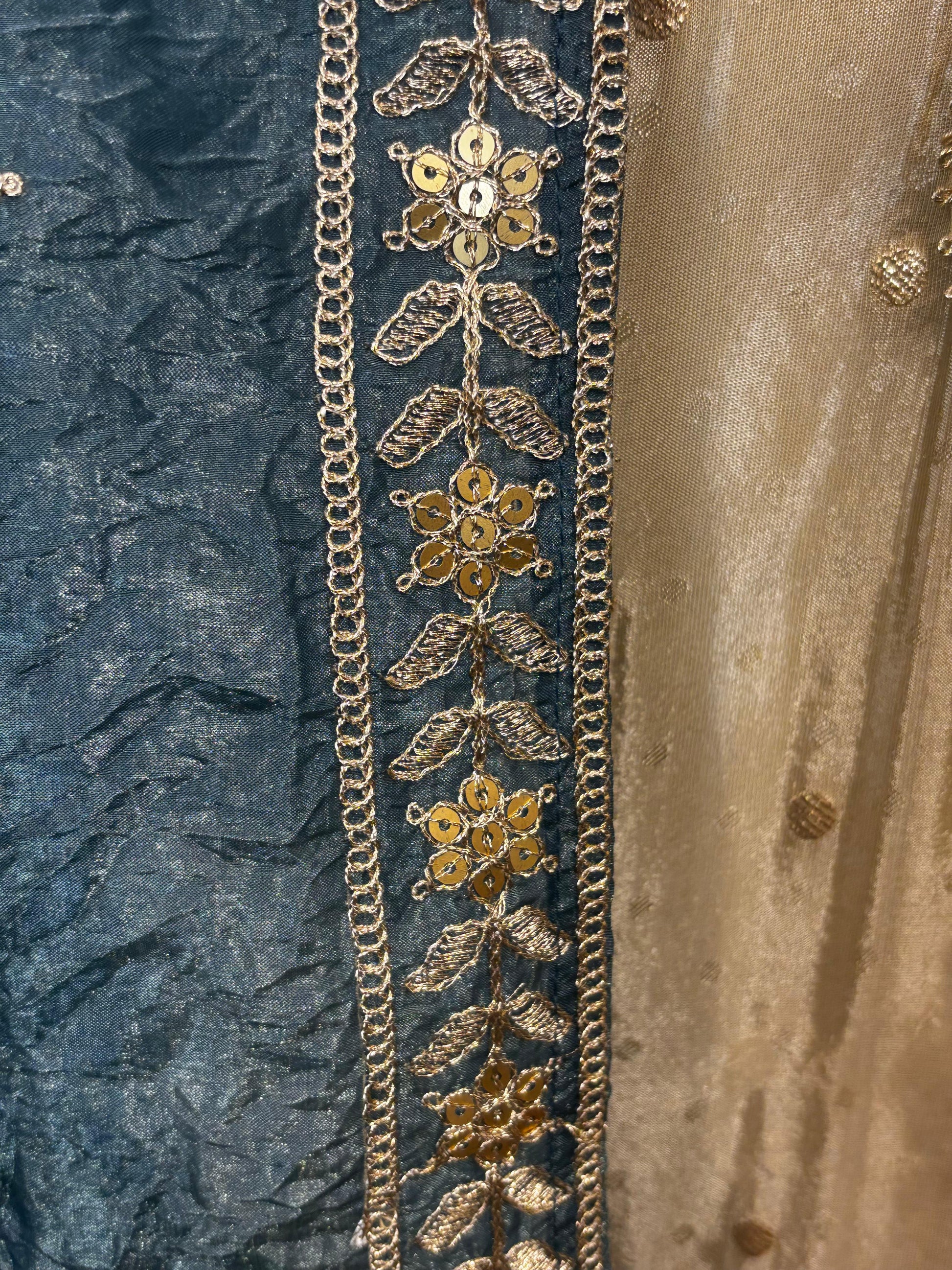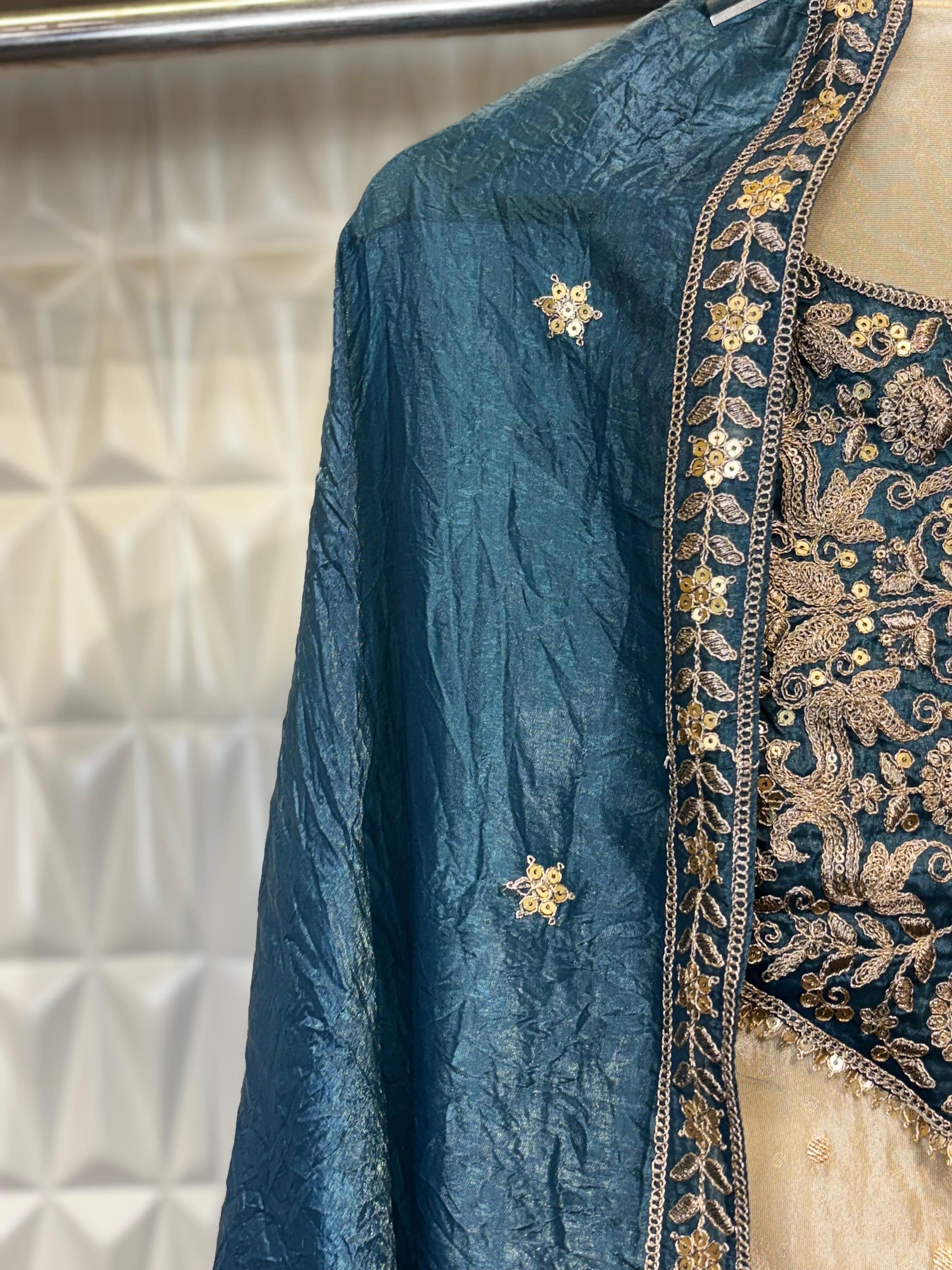 Graceful Tissue Suit Set featuring a soft tissue fabric with a matching 2.5m bottom in the same base color. The suit is beautifully enhanced with hand embroidery, Zari and sequins work, and intricate embellishments all over the neck for a rich, traditional touch. The blue dupatta is adorned with a luxurious gold weaved zari bootis & border all over. The kurta is finished with playful Lace hanging, adding a festive and elegant charm—perfect for special occasions and celebrations.