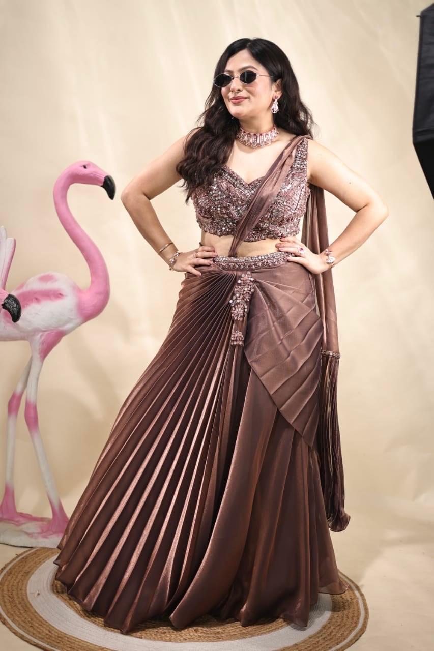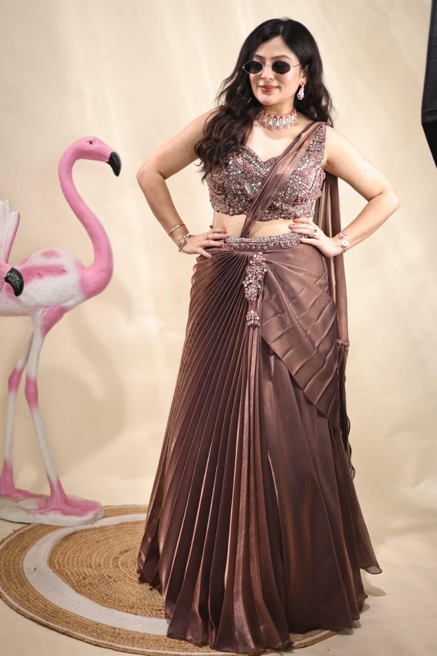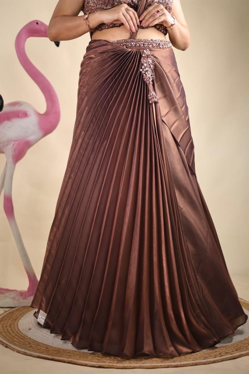 Very stylish pleated skirt & crop top on organza tissue fabric, pre-draped with blouse all hand embroidered with very stylish embroidered belt overlapped on skirt crafted for cocktail events and weddings, this masterpiece radiates grace and tradition.