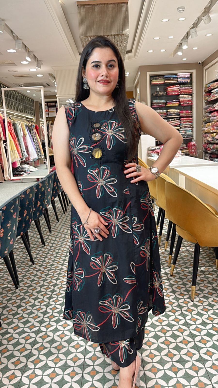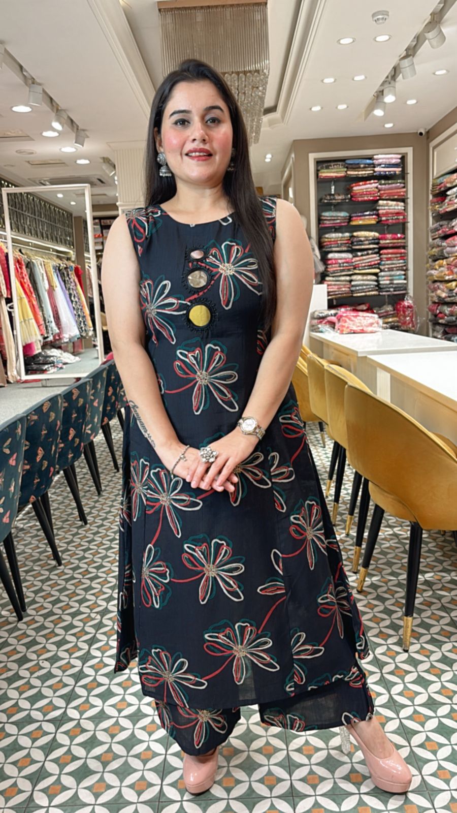 Elevate your ethnic wardrobe with this elegant ready made Kurta Set. Crafted from soft, comfortable fabric, this ensemble blends timeless charm with modern detailing. The kurta features delicate mirror and pearl work highlighting along the neckline, adding a subtle yet sophisticated sparkle. Paired with a stitched bottom in matching print, this outfit offers both style and ease—making it perfect for festive gatherings, family functions, or casual celebrations.