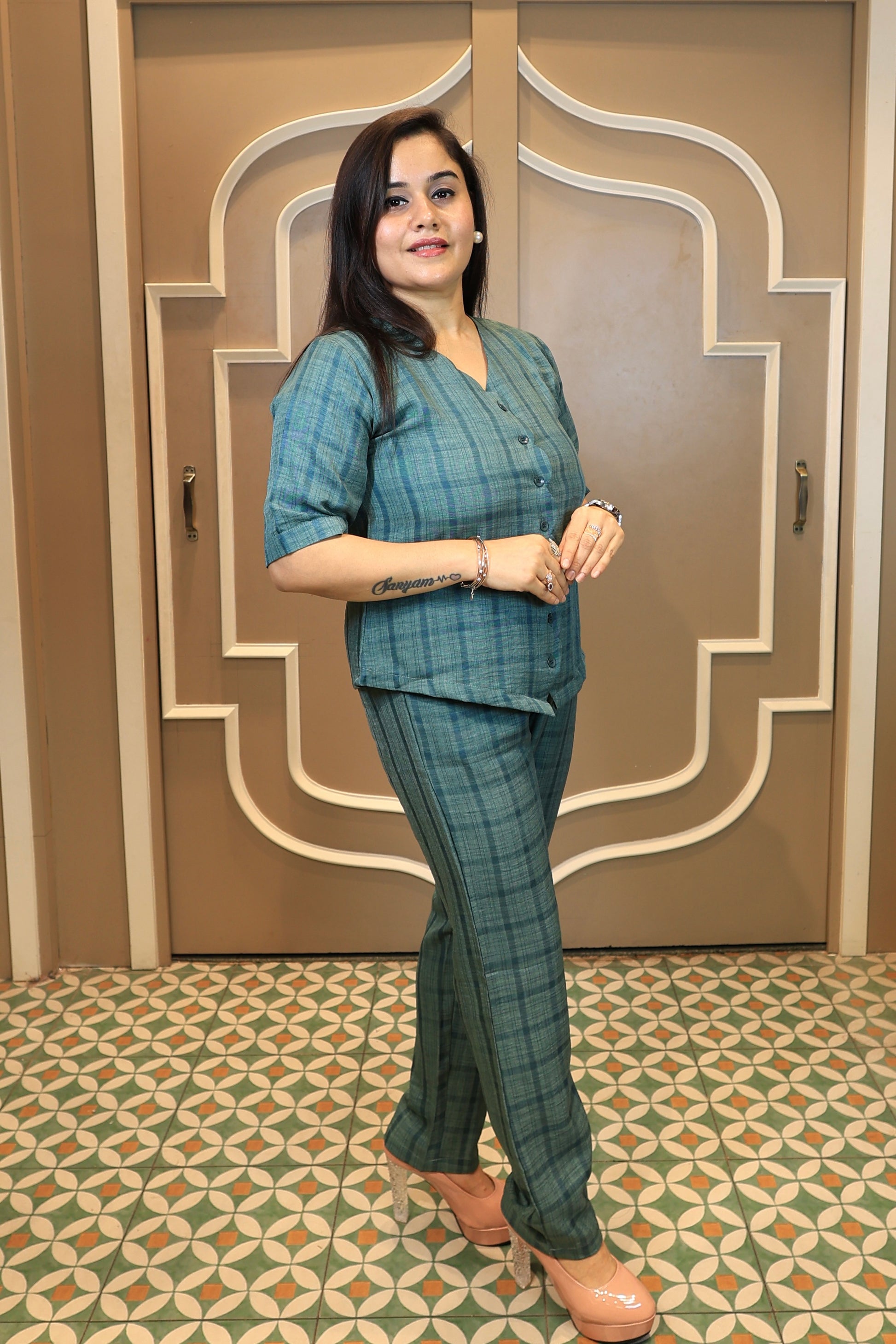 Check scalloped green co-ord set