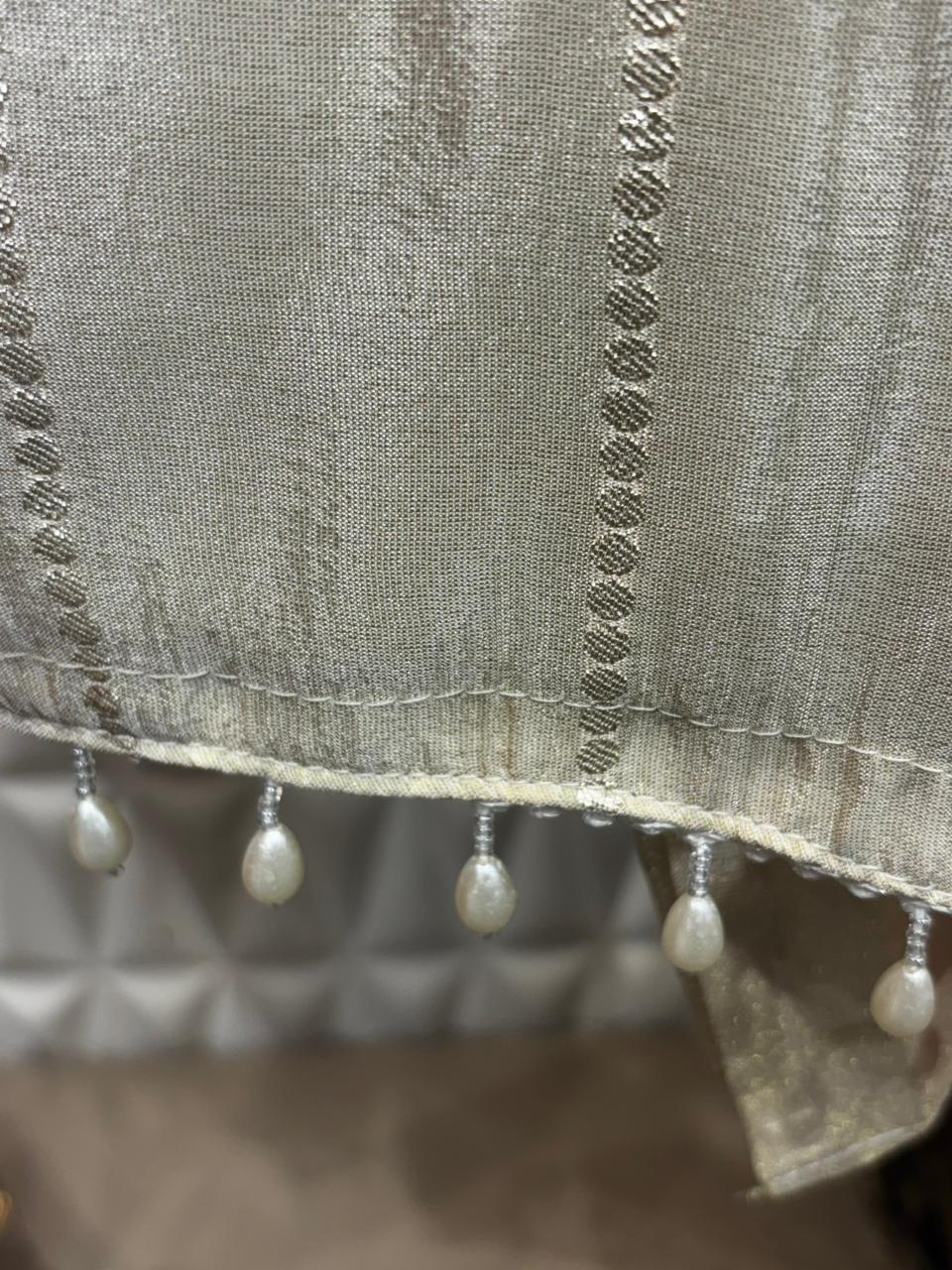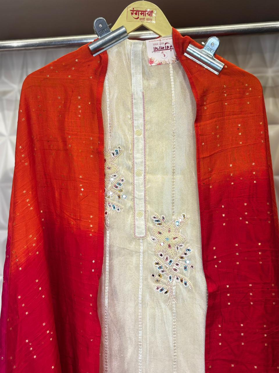 Elegant tissue suit set featuring an ultimate mirror and pearl hand embroidery concept