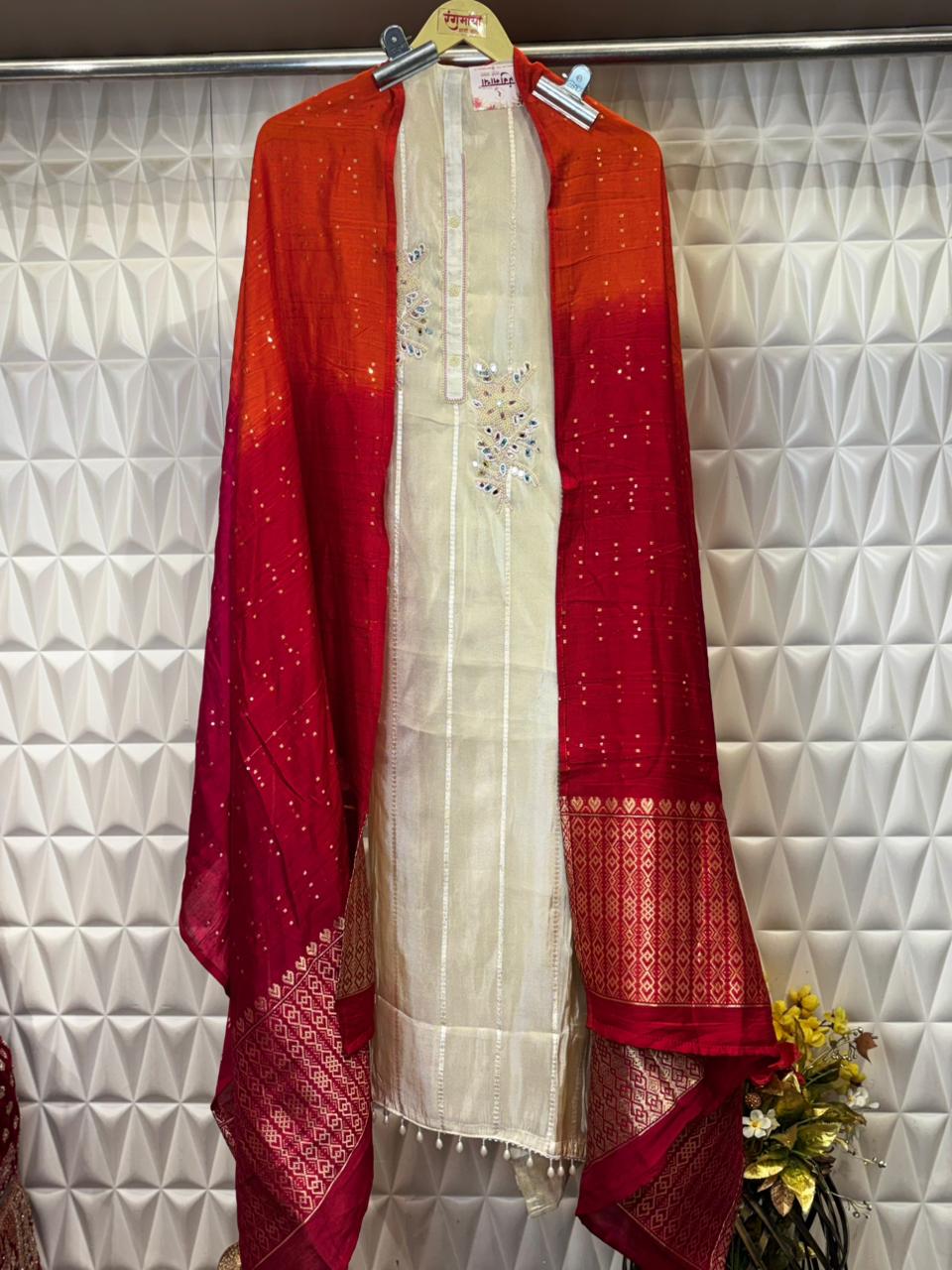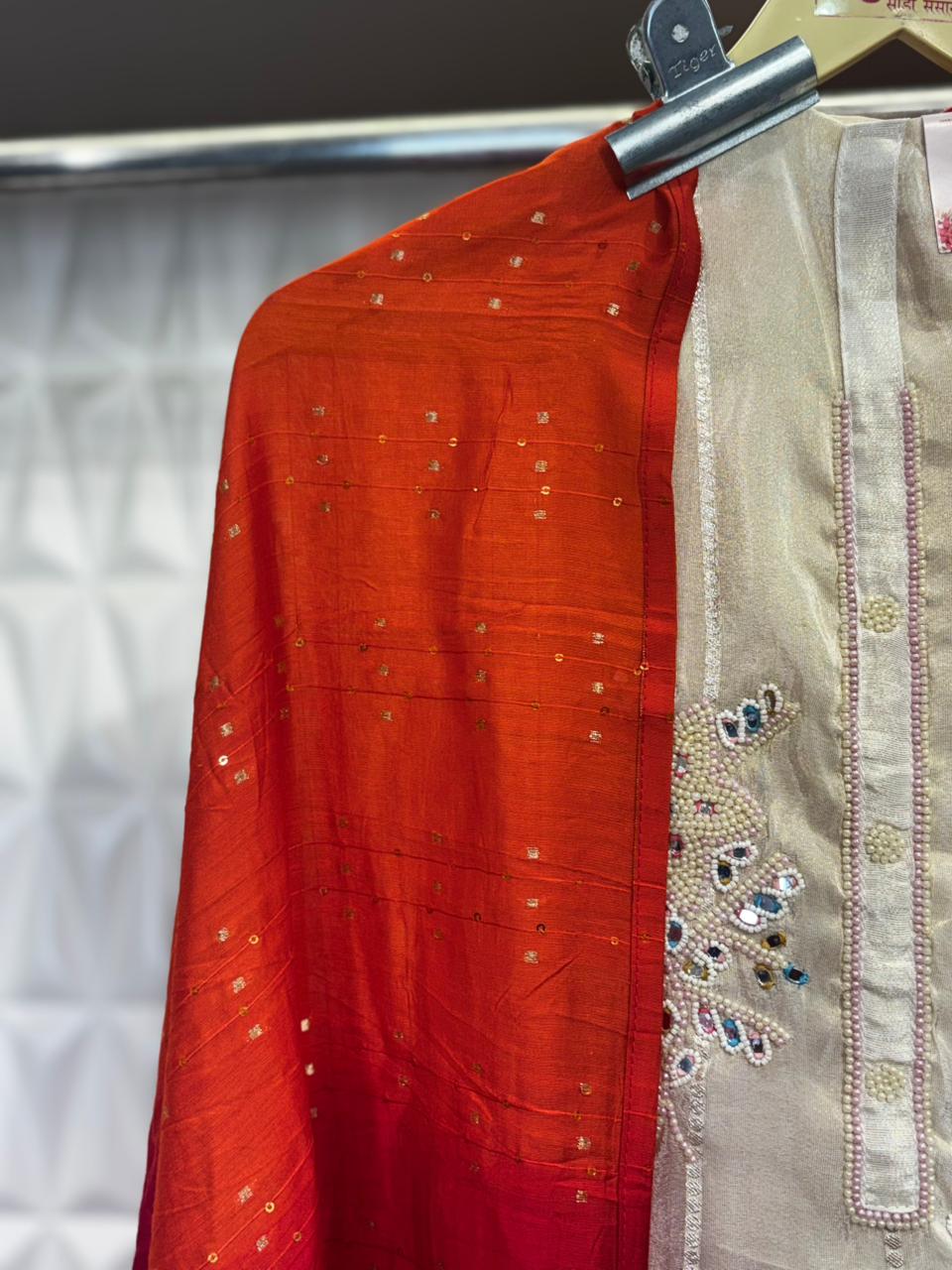 Elegant tissue suit set featuring an ultimate mirror and pearl hand embroidery concept and delicate pearl lace hangings. The 2.5m cotton silk dupatta adds effortless grace, while the bottom matches the base color and comes unstiched for a perfect fit. The contrast orangish red color combination makes this outfit blends sophistication with subtle luxury.